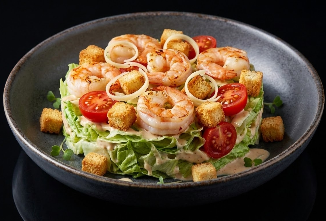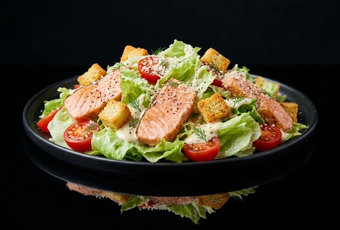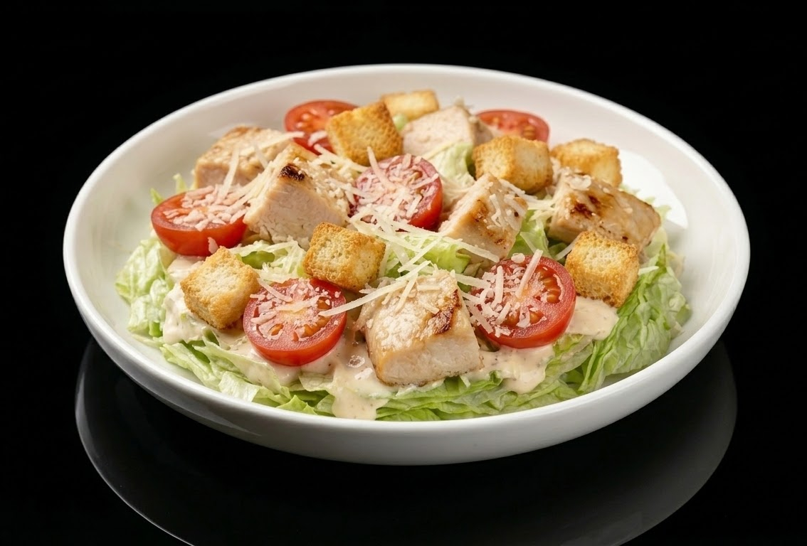 Салат "Айсберг", помидорки "Черри", курица, сухарики, соус "Цезарь", сыр "Пармезан"