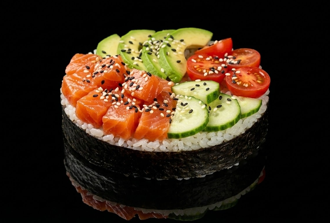 Рис, нори, авокадо, огурец, лосось, помидор «Черри», кунжут