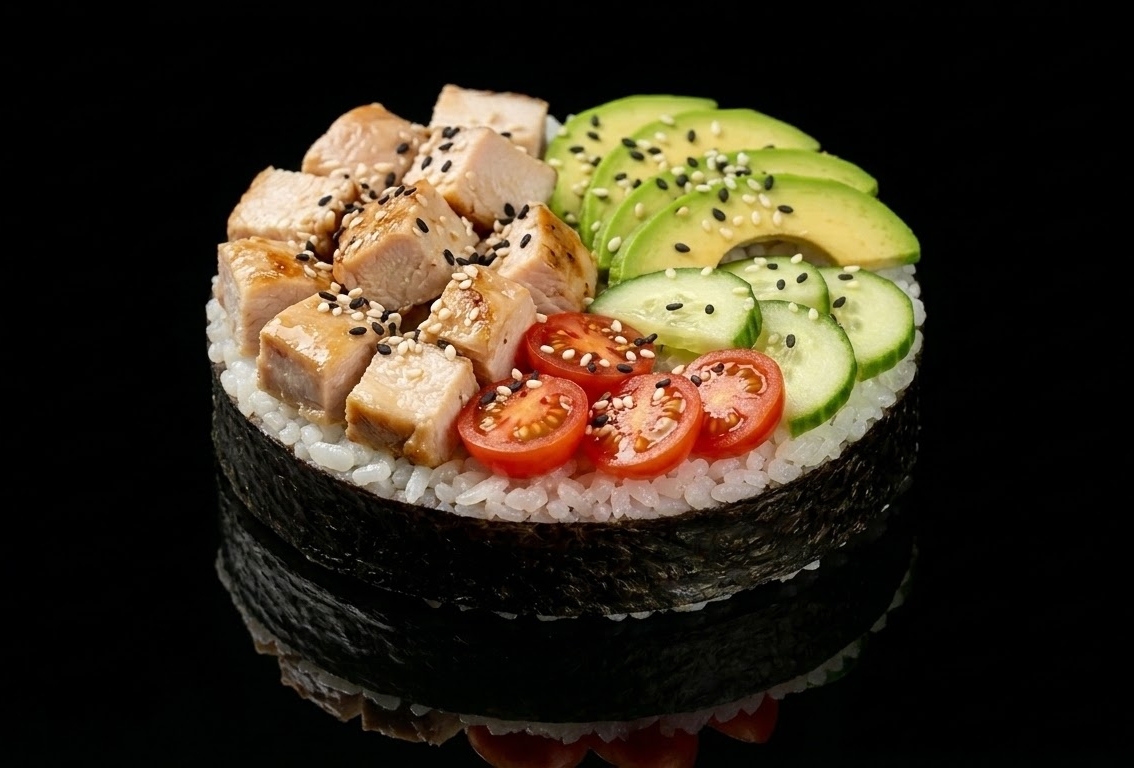 Рис, нори, авокадо, огурец, курица, помидорки «Черри», кунжут