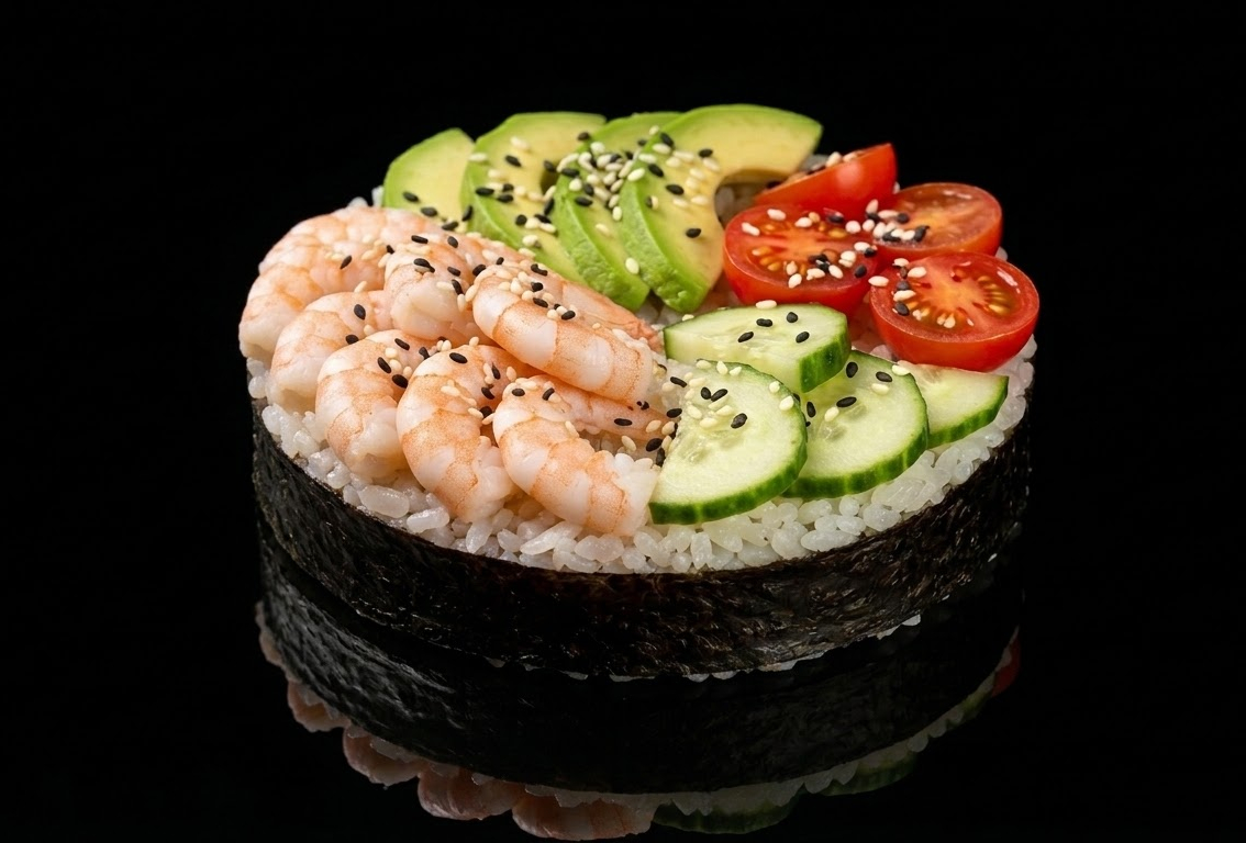 Рис, нори, авокадо, огурец, креветка, помидорки «Черри», кунжут