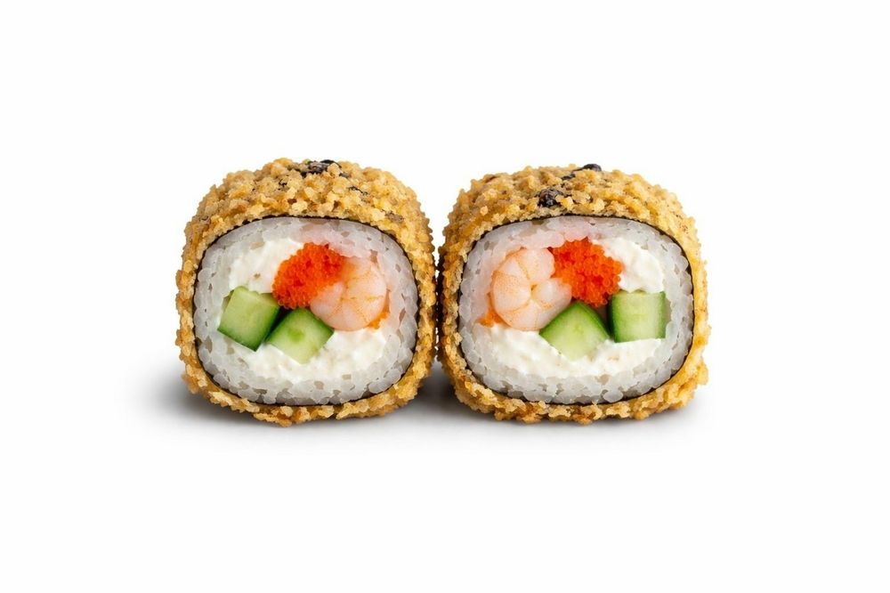 Сыр филадельфия, огурцы, креветка, икра тобико, кляр, панировочные сухари