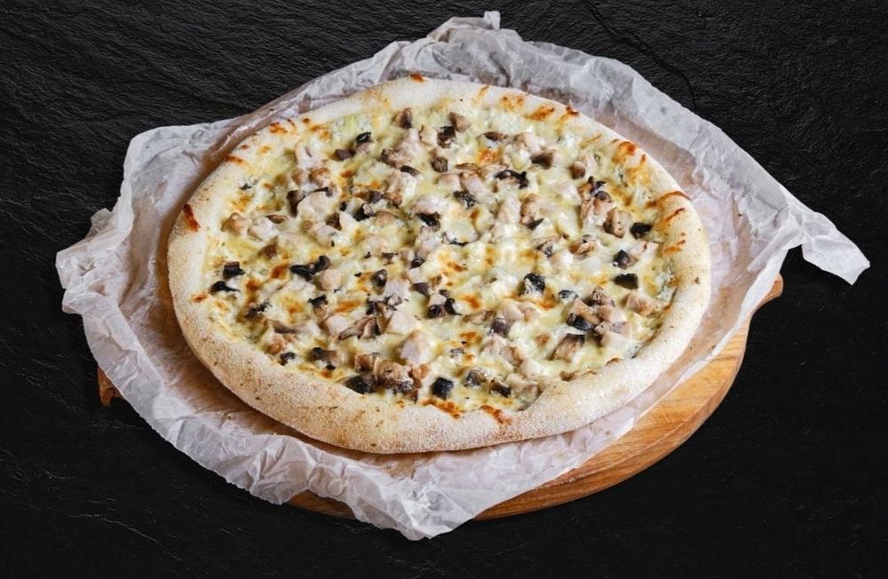 Соус чесночно-сливочный, сыр моцарелла, курица, грибы, лук