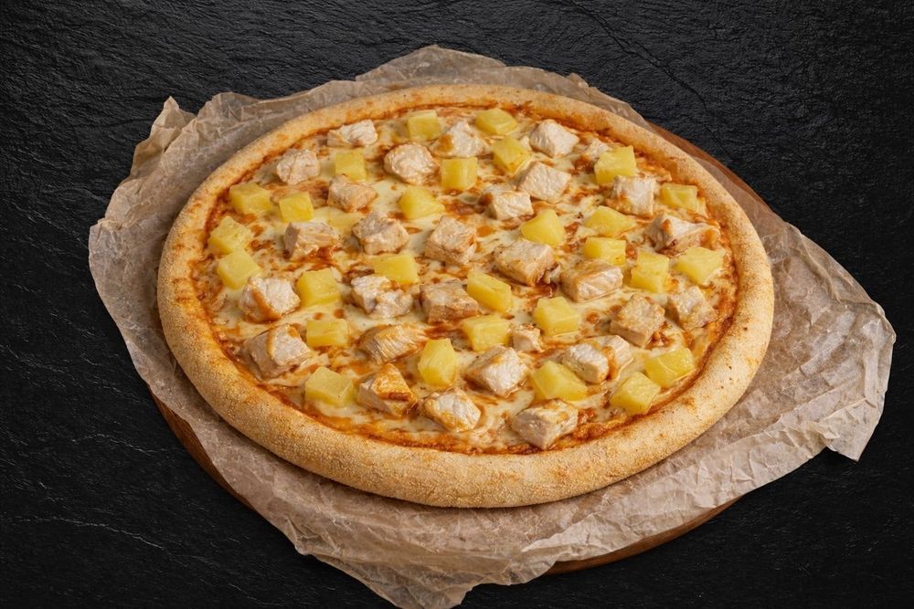 Соус чесночно-сливочный, сыр моцарелла, курица, ананасы