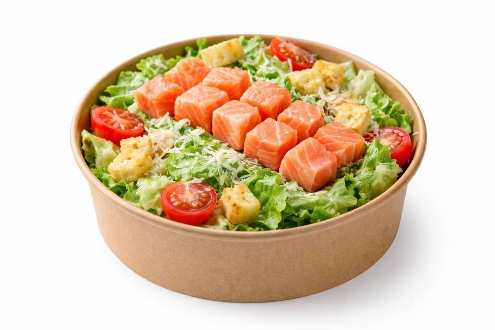 Салат «Айсберг», помидорки «Черри», лосось, сухарики, соус «Цезарь», сыр «Пармезан»