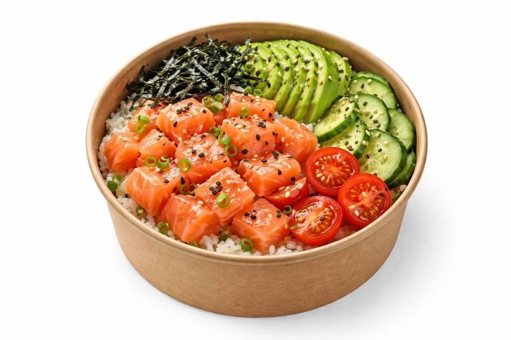 Рис, нори, авокадо, огурец, лосось, помидор «Черри», кунжут